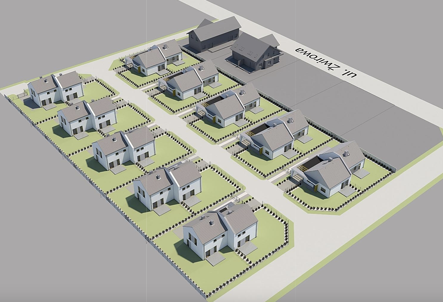 Każdy dom będzie stał na samodzielnej, wydzielonej działce z dostępem do drogi. Od strony północnej zlokalizowano wjazdy, miejsca postojowe oraz strefy wejściowe. Kameralne podwórka oraz strefa wypoczynkowa z tarasami zostały umieszczone od strony południowej.