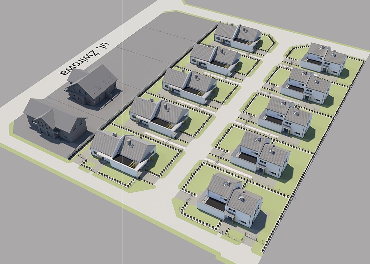 Każdy dom będzie stał na samodzielnej, wydzielonej działce z dostępem do drogi. Od strony północnej zlokalizowano wjazdy, miejsca postojowe oraz strefy wejściowe. Kameralne podwórka oraz strefa wypoczynkowa z tarasami zostały umieszczone od strony południowej.